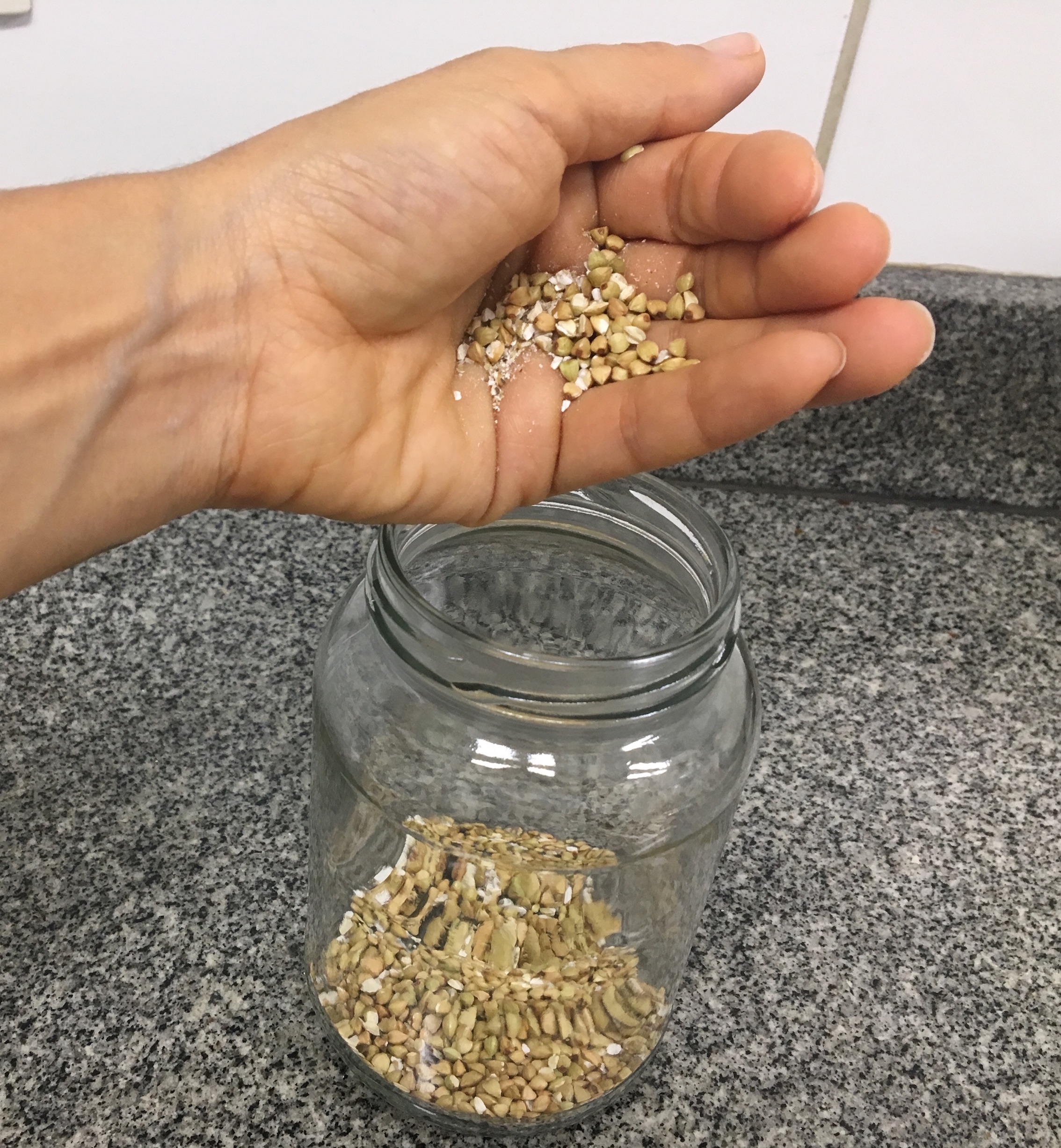 - Colocar uma pequena quantidade (duas colheres de sopa cheia ou uma mão bem cheia) em um recipiente, costumo usar vidros de palmito.
