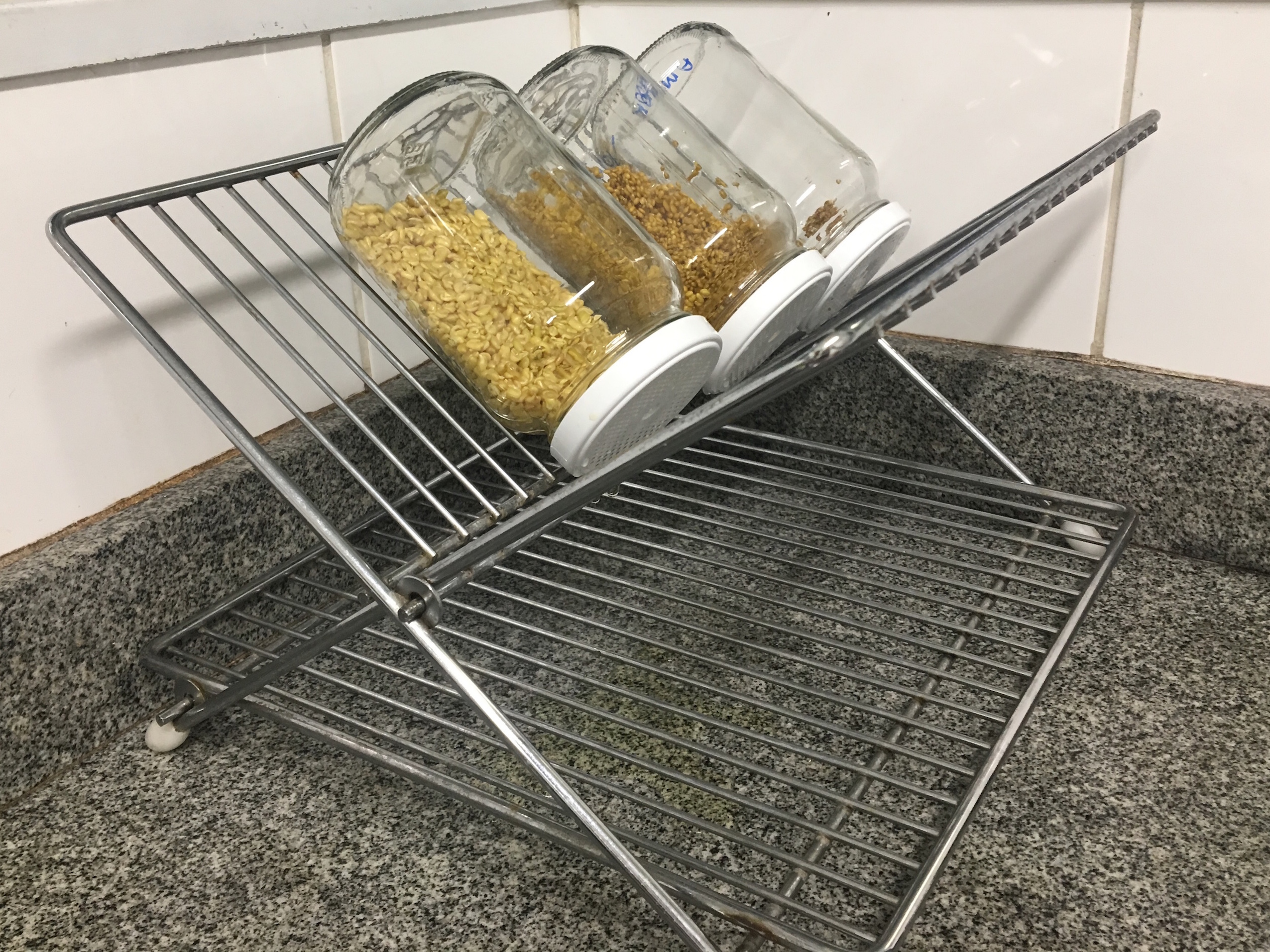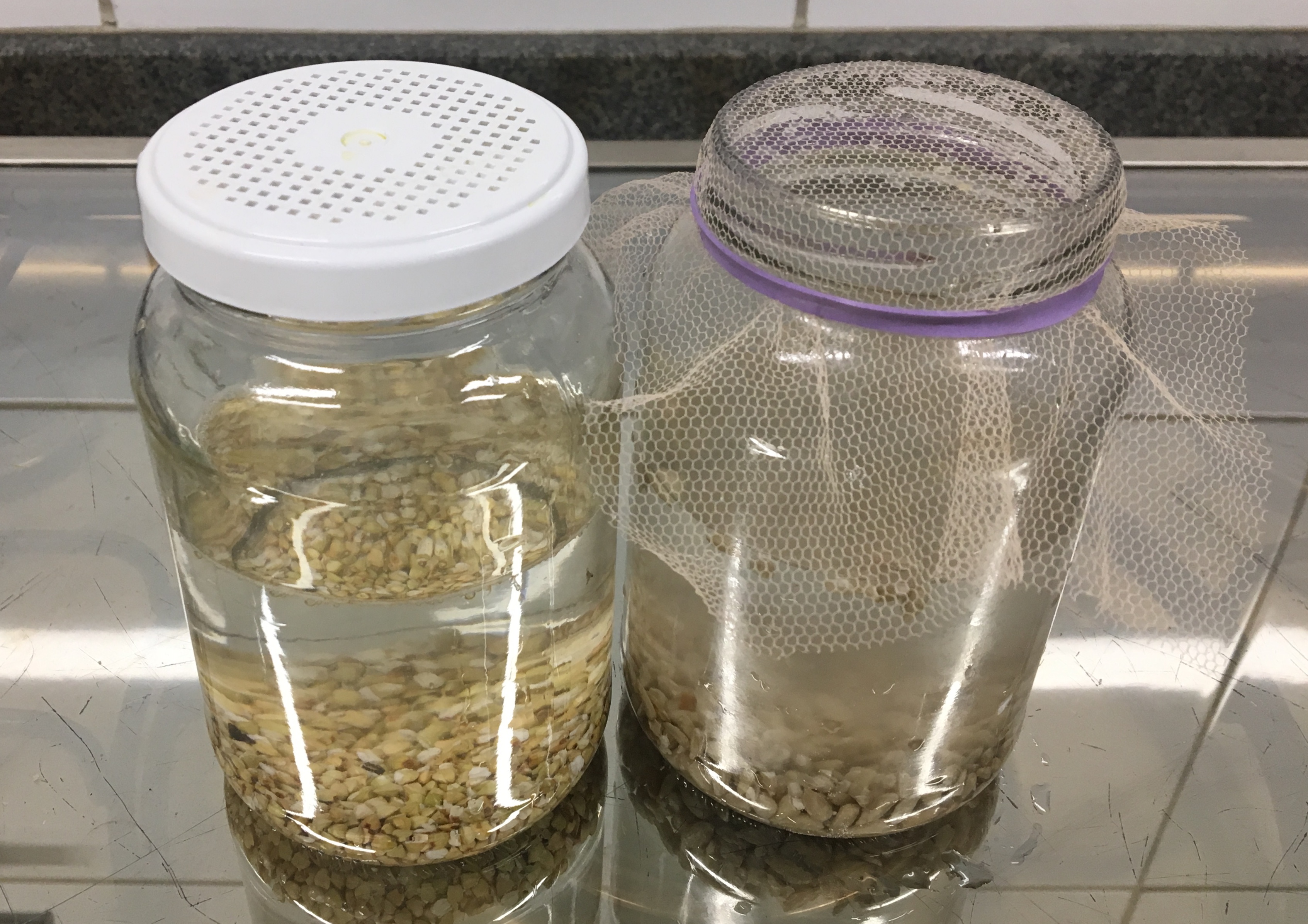 - Eliminar a água do vidro e lavar as sementes em torno de 4 vezes, escorrer toda água e tampar novamente.